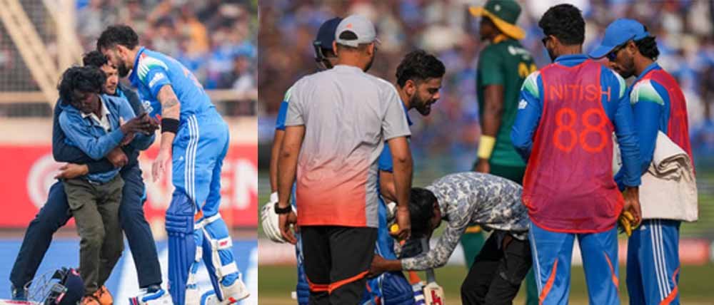 भारत और दक्षिण अफ्रीका के बीच खेले जा रहे दूसरे वनडे में स्टार बल्लेबाज विराट कोहली ने एक बार फिर धमाकेदार प्रदर्शन से प्रशंसकों का दिल जीता है। उन्होंने 90 गेंदों में अपने वनडे करियर का 53वां शतक जड़ा। इस मैच में भी स्टेडियम की सुरक्षा पर सवाल खड़े हुए। दरअसल, ड्रिंक्स ब्रेक के दौरान एक प्रशंसक किंग कोहली के करीब पहुंचा और उनके पैर छुए। ऐसा ही रांची वनडे में भी देखने को मिला था।